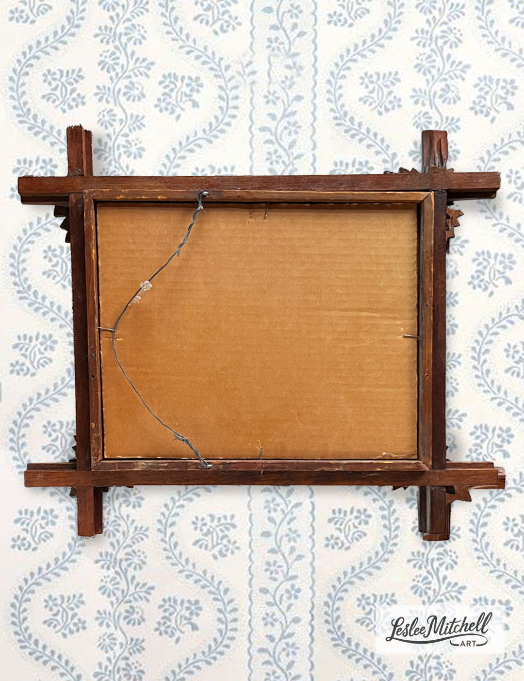 Framed behind glass in 19th Century tramp art, hand-carved folk art frame. Painting size 9 1/2 x 8 inches. Overall frame size 15 x 13 inches. Ready to hang. Perfect for a living room, office, or serene bedroom.