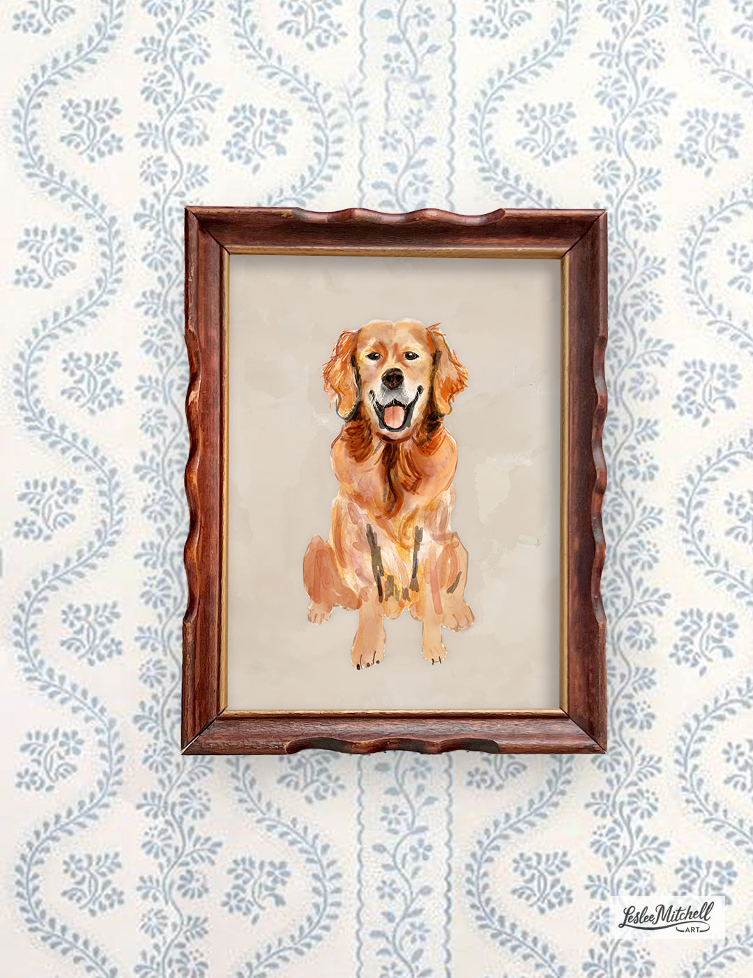 This giclée art print of an original golden retriever watercolor captures the warm, loyal and joyous personality of the breed, highlighting the warm, amber tone of their fur and their soulful, gentle eyes.