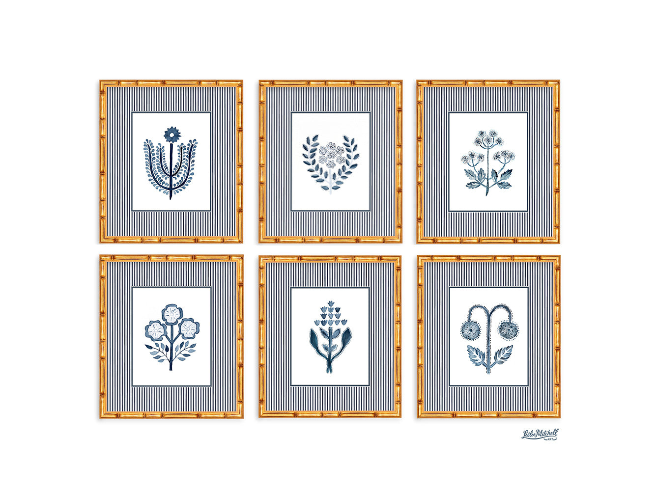 This is is a navy botanical series. Professionally framed in a gold bamboo frame behind UV protected clear acrylic glazing with a custom navy mini stripe mat with navy accent.